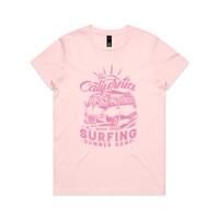 Capture the essence of endless summer with this vintage-inspired design, perfect for anyone who hears the call of the waves. This retro print pays homage to the sun-drenched shores of California, featuring a classic surf van that's ready to hit the beach. Whether it's for a day catching waves or just dreaming of the next seaside adventure, this design brings the spirit of surf and sun right to your wardrobe.